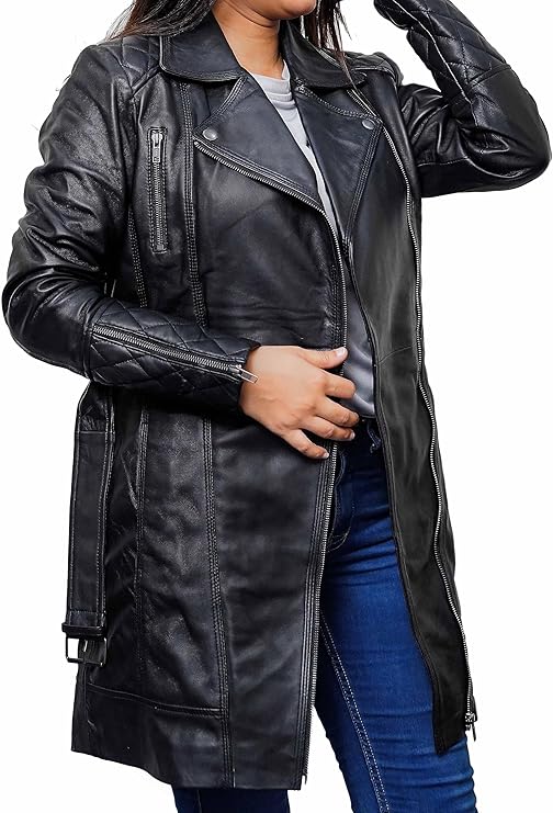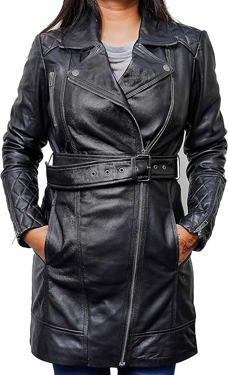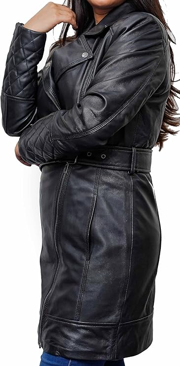 Experience elegance with this women's mid-length black sheepskin leather trench coat, designed for the lady who is taking to class and luxury as sartorial inspiration. A streamlined cut makes it perfectly suitable for both casual and formal wear adding an effect of sophistication and tailored fit. Black sheepskin leather offers chic versatility, and one can see why this would complement just about every outfit.